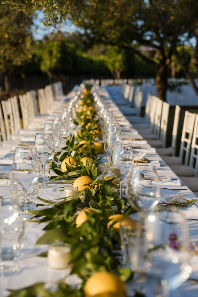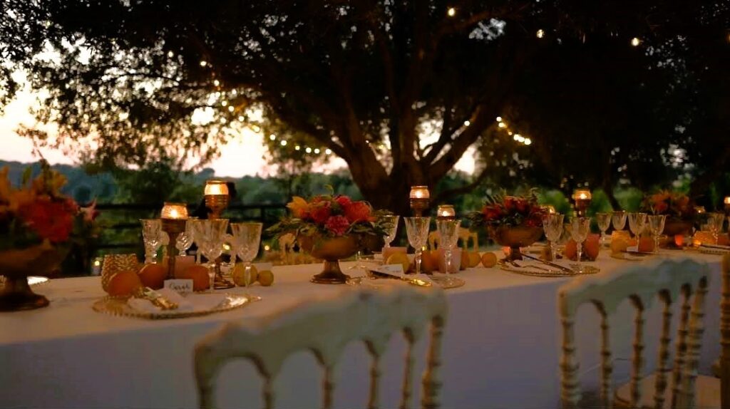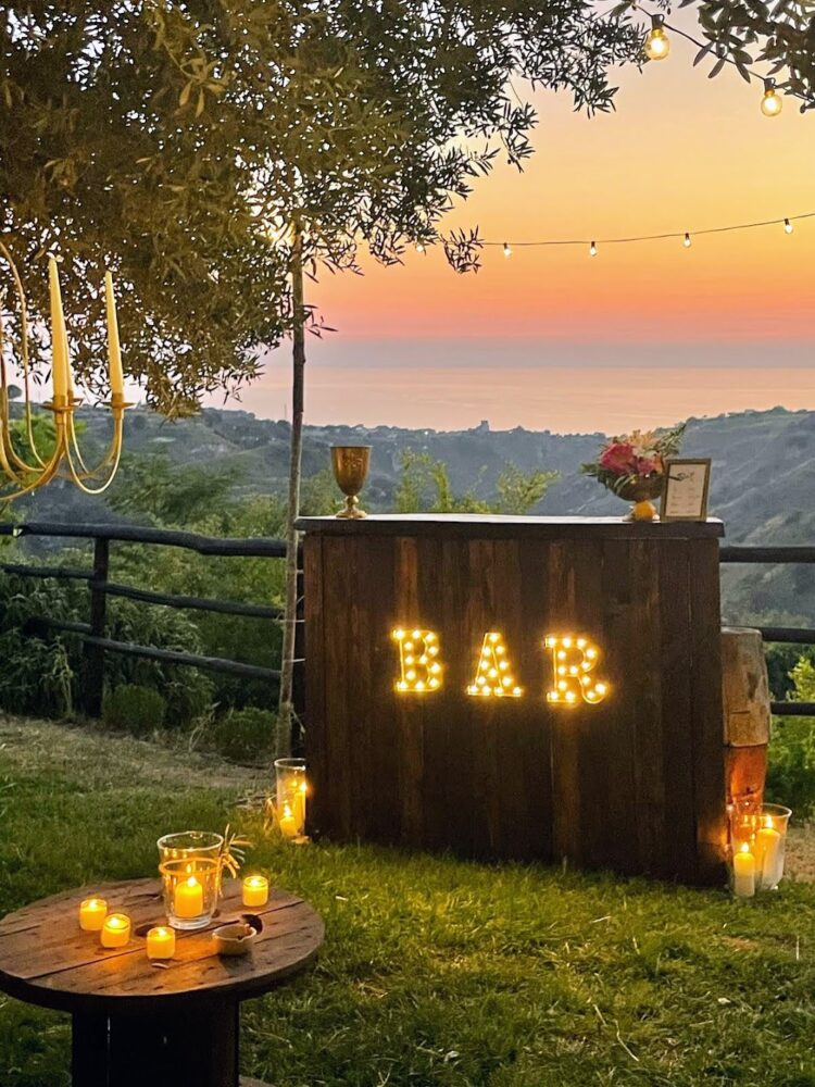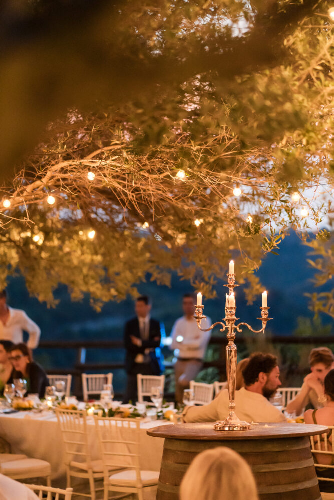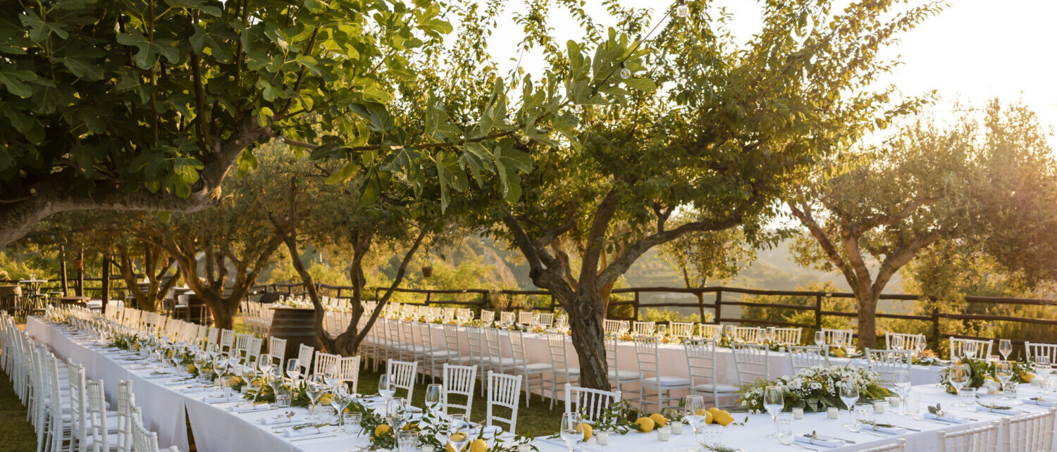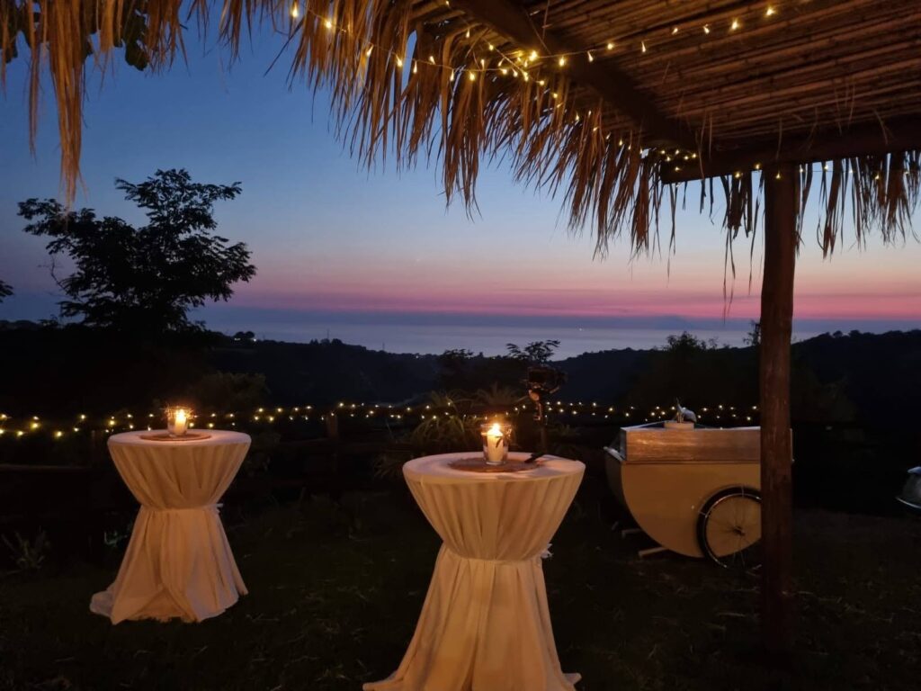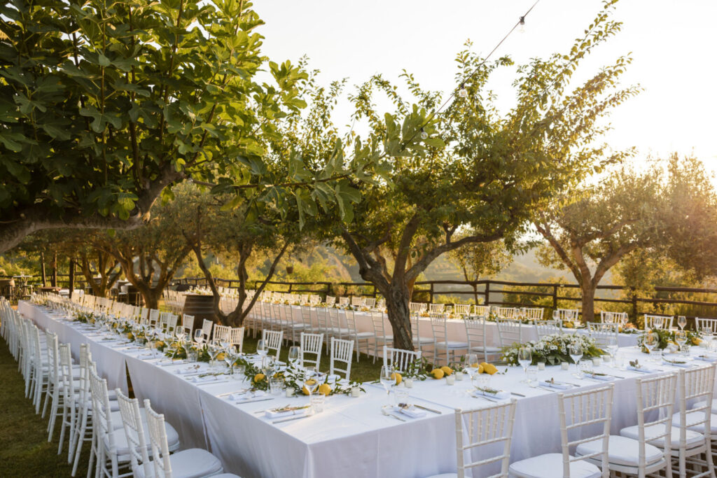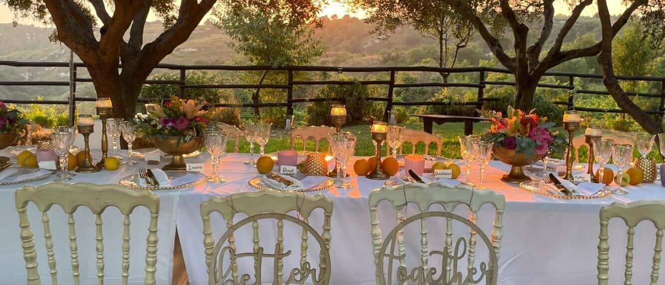 Romantic event location nestled among rolling vineyards with panoramic sea views. Receptions take place outdoors beneath ancient olive trees, creating an intimate and atmospheric setting where nature, sunset light, and the surrounding landscape come together for unforgettable celebrations.